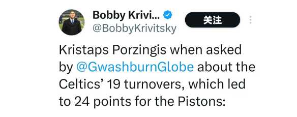 当被问及凯尔特人全场19次失误让活塞得到24分时,波尔津吉斯回应道:“对手下手很凶,裁判也没有吹罚太多犯规。所以这场比赛需要我们快速适应,但我们没有做到,尤其是我。我情绪有些激动,因为没有得到一些我们通常能得到的哨子。”
