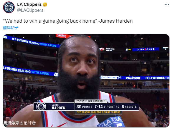 值得一提的是,哈登命中制胜三分后激情庆祝,快船替补席沸腾了,小卡为登哥挥毛巾狂欢;赛后哈登表示:我们必须带着胜利回家。
