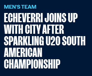 官方:19岁阿根廷球员埃切维里正式加盟曼城 曾带队获南美U20锦标赛亚军