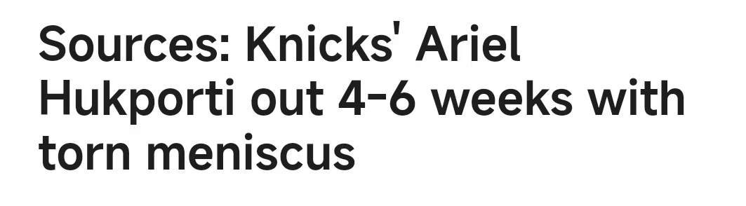 2025-02-28 06:30北京时间2月28日,据名记Shams报道,消息人士透露,纽约尼克斯队中锋阿里尔-胡克波蒂左膝半月板撕裂,预计将缺阵4至6周。