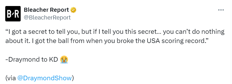 追梦对杜兰特说:“我有个秘密要告诉你,但如果我告诉你这个秘密……你也无能为力了。当你打破美国队得分记录时,我把那颗球拿走了。”