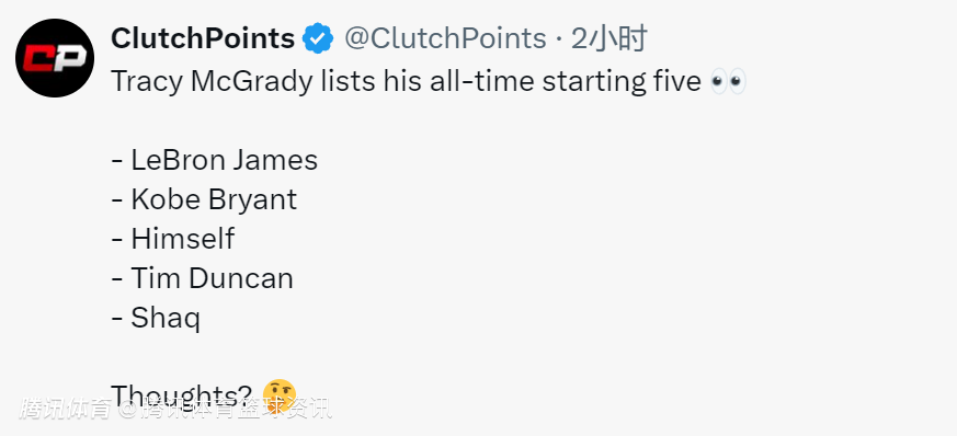 2025-02-28 08:20北京时间2月28日,美媒Clutch Points更新动态,前NBA球星麦迪评出他心目中的历史最佳首发5人组,乔丹、魔术师等传奇球星未入选。具体名单分别是:詹姆斯、科比、麦迪、邓肯、奥尼尔。