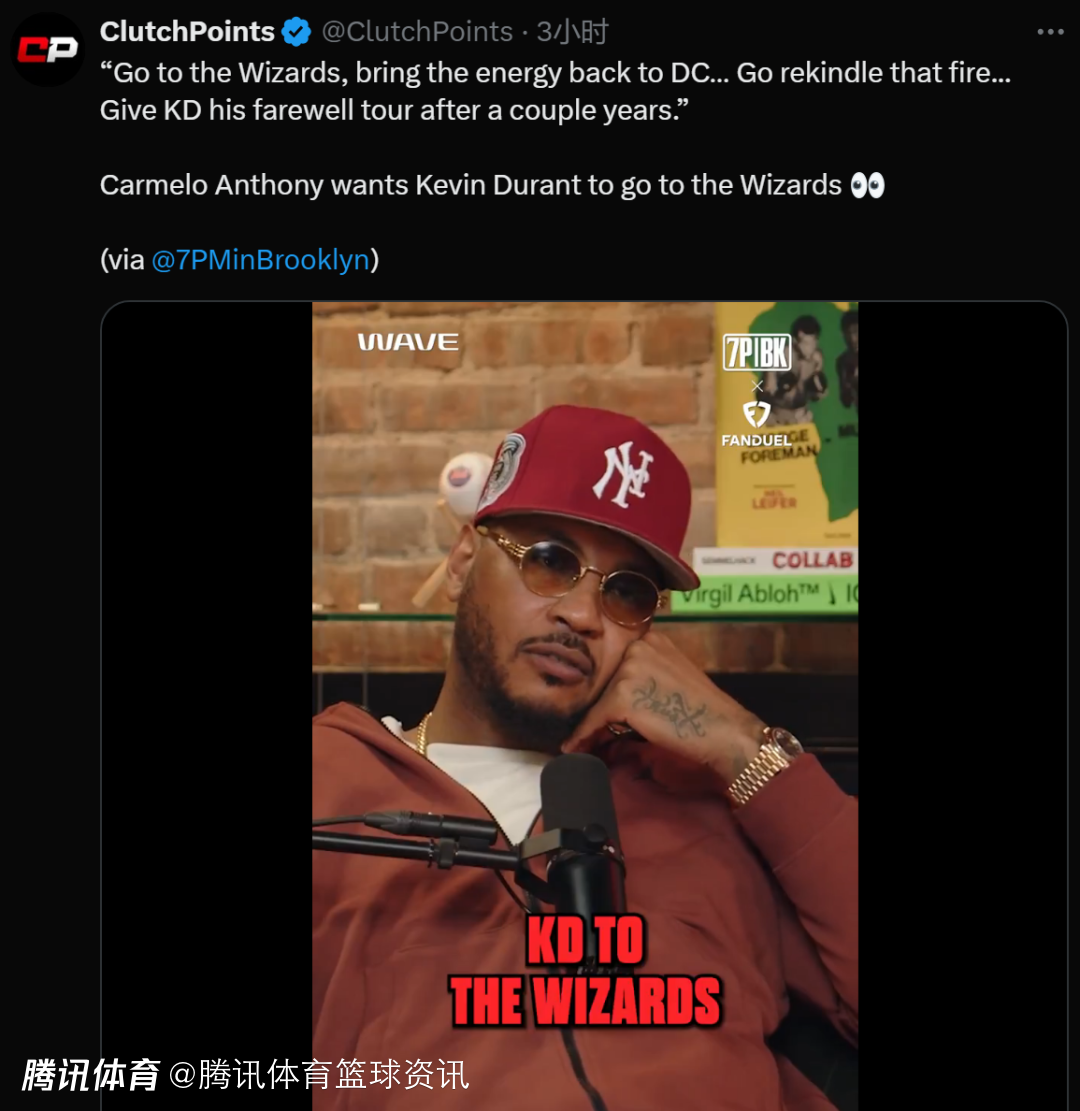 安东尼说道:“我建议他前往奇才队,为华盛顿特区重新注入活力,重燃那股激情。几年后,再为杜兰特开启一场盛大的退役巡演。”安东尼的建议正是基于华盛顿是杜兰特的老家。