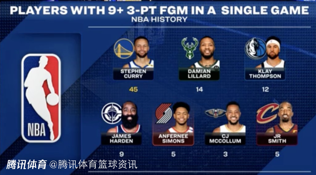 断层历史第一!库里单场9+三分场次已达45场 多名现役球员总和都不如他
