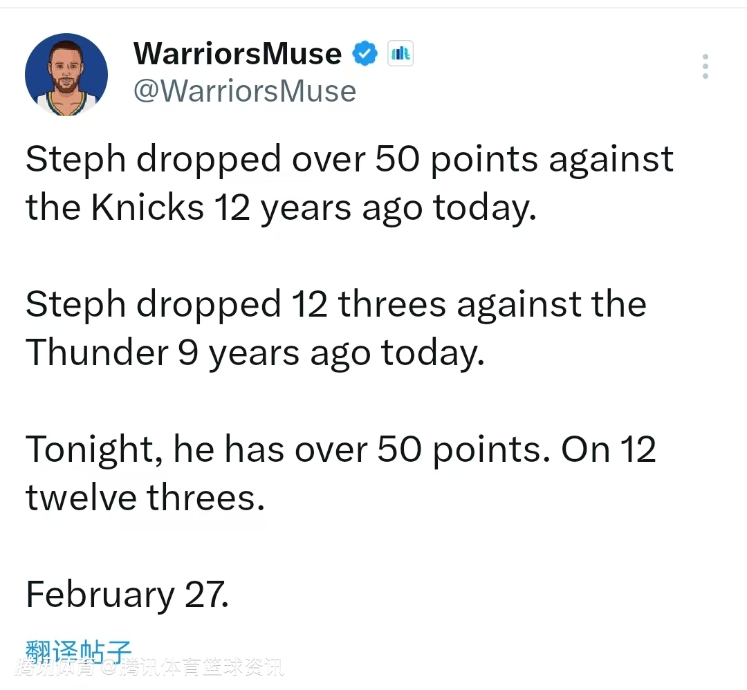 2月28日(北京时间)这一天似乎是库里的幸运日。美媒数据显示,12年前的今天,库里在对阵尼克斯的比赛中砍下50分,9年前的今天,他在对阵雷霆的比赛中投进12个三分球。今天,他再次砍下50+并命中12个三分球。