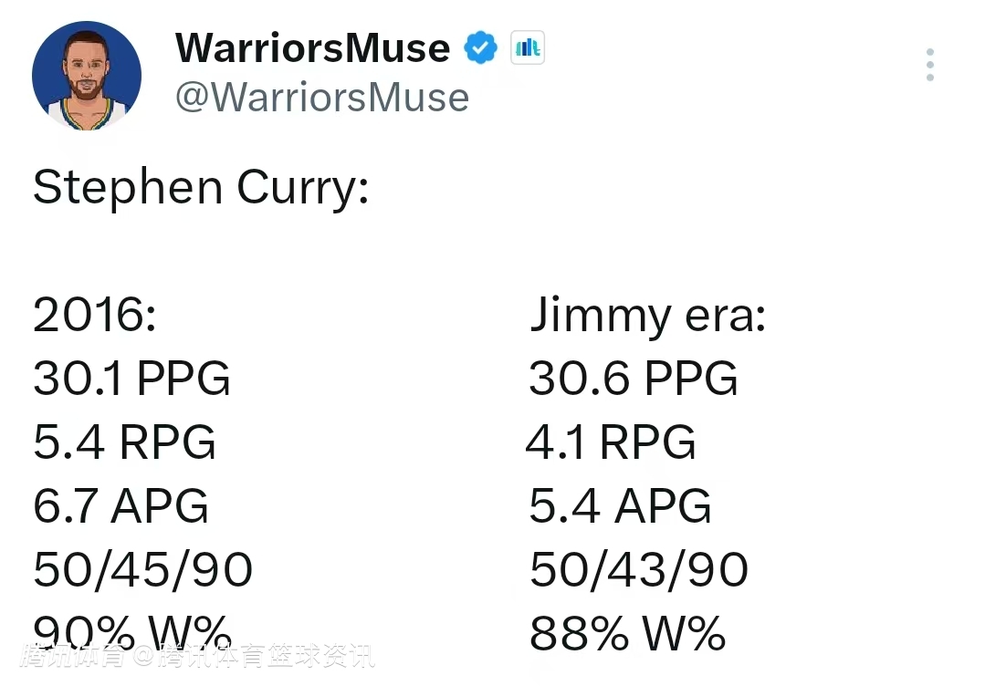 库里在2015-16赛季(MVP赛季)曾场均得到30.1分5.4篮板6.7助攻,三项命中率为50%/45%/90%,打出90%的胜率。本赛季自巴特勒加盟以来,库里再次拿出MVP级别表现,场均得到30.6分4.1篮板5.4助攻,三项命中率为50%/43%/90%,胜率也高达88%。