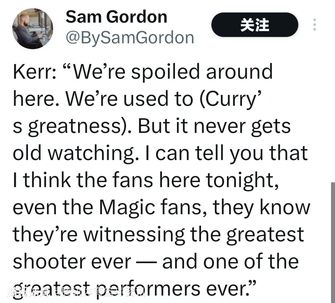 科尔还说道:“我们已经被库里的表现宠坏了,习惯了他这样的伟大表现。但无论看了多少次,他的比赛永远不会让人厌倦。今晚在场的球迷们,无论是勇士队的球迷还是魔术队的球迷,都知道自己正在见证历史上最伟大的射手之一,甚至是历史上最伟大的表演之一。”