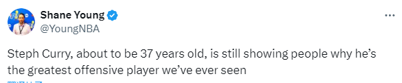 美记Shane Young发推点评本场比赛:库里即将年满37岁,他仍在向人们证明为何他是我们见过的最强进攻球员。