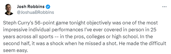 奇才随队记者Josh Robbins发推道:库里今天砍下56分,这是我亲身报道各种体育赛事25年来印象最深的个人表演之一,包括职业比赛、大学以及高中比赛。在下半场库里都丢了一个球时,我竟然感到惊讶。他能让天堑变通途。