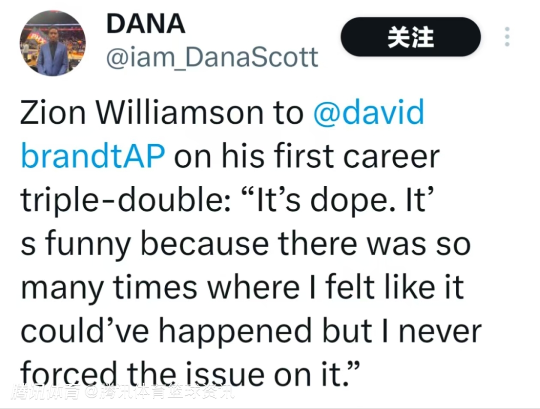 在谈到自己职业生涯首次三双时,锡安说道:“这感觉太棒了。挺有意思的是,其实有很多次我都觉得可能会拿到三双,但我从没刻意去追求它。”