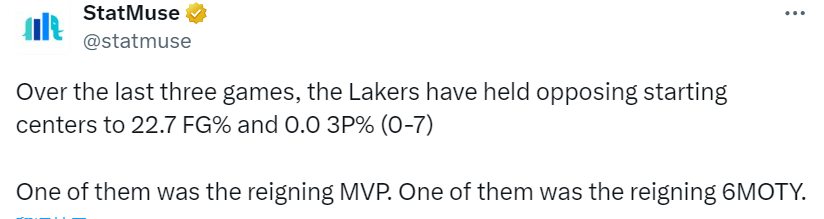 赛后,根据数据统计显示,在过去的三场比赛中,湖人队将对手首发中锋的投篮命中率限制在22.7%,三分命中率为0.0%(7投0中),其中一位是上赛季的MVP约基奇,一位是上赛季的最佳第六人纳兹-里德。