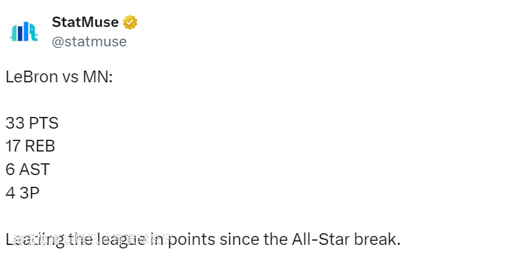 2025-02-28 14:40北京时间2月28日,NBA常规赛继续进行,湖人主场以111-102战胜森林狼。詹姆斯出战37分钟,全场21投11中,其中三分球9投4中,罚球10投7中,得到33分17篮板6助攻1抢断1封盖,东契奇出战36分钟,全场20中6,其中三分球9中1,得到21分13篮板5助攻,里夫斯出战38分钟,全场10中5,其中三分球5中2,得到23分6篮板5助攻2抢断。