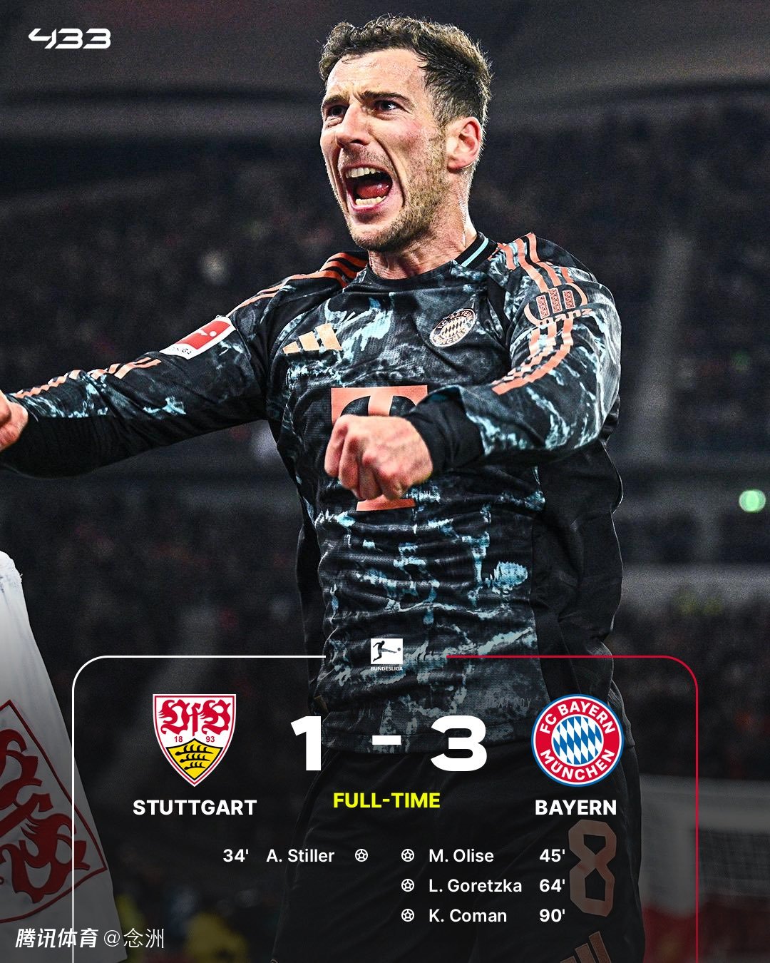 德甲第24轮,拜仁客场3-1击败斯图加特,先赛1场11分领跑。斯蒂勒先拔头筹,奥利塞扳平,格雷茨卡反超比分,科曼锁定胜局。