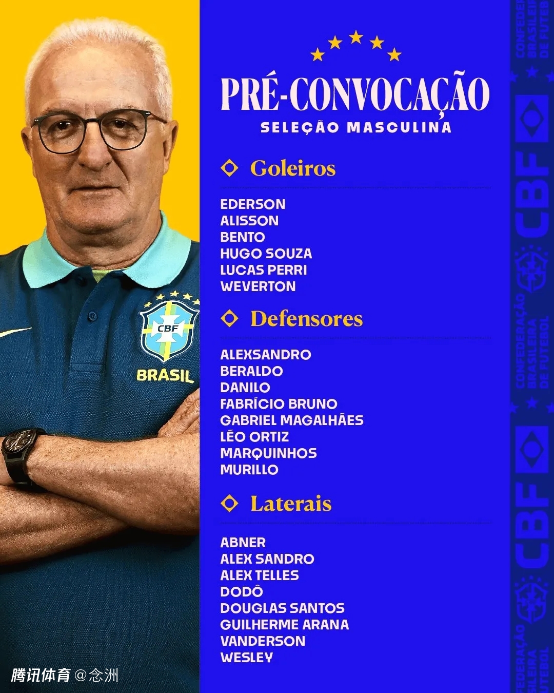 巴西足协公布了一份由多里瓦尔选定的52名球员名单,内马尔、奥斯卡、安东尼入选。巴西将于6月20日和25日分别对阵哥伦比亚和阿根廷,最终名单将于下周五公布。