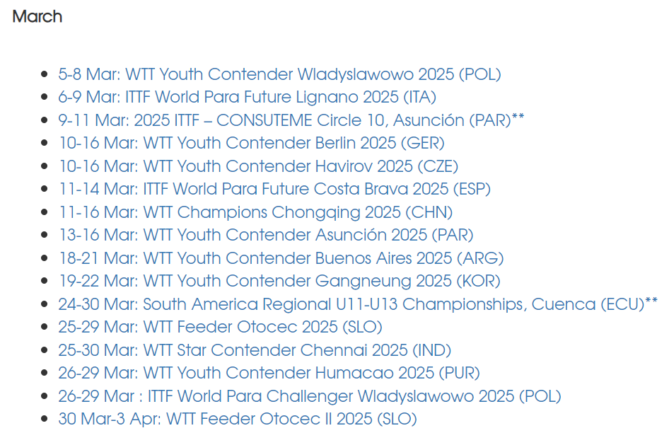 3月世界乒联还将举办多个WTT赛事,除前文提到的重庆、金奈站以外,还有两站级别垫底的支线赛,而且都是在斯洛文尼亚的奥托塞克,时间分别在3月25日至29日、3月30日至4月3日,不过暂未见有国乒选手上榜。