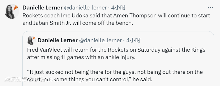 范弗利特连缺11场后终于复出!乌度卡公布火箭新首发:小贾继续替补