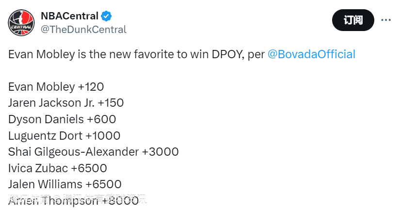 最佳防守球员奖赔率更新:莫布利成为头号热门 小贾伦-杰克逊排名第二
