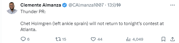 2025-03-01 10:20北京时间3月1日,NBA常规赛继续进行,雷霆队对阵老鹰队。在上半场比赛结束后,雷霆队官方宣布,切特-霍姆格伦因脚踝扭伤退出比赛。