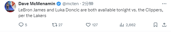 2025-03-01 10:40北京时间3月1日,NBA常规赛继续进行,湖人队对阵快船队。赛前,湖人队记者Dave McMenamin透露,詹姆斯和东契奇都可以出战本场比赛。