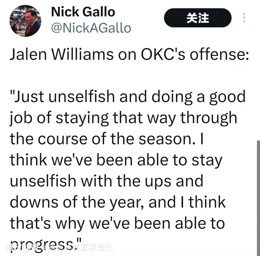 杰伦-威廉姆斯谈到雷霆队的进攻表现时表示:“我们的进攻一直保持着无私,并且在整个赛季中始终如一。尽管本赛季经历了起伏,但我们始终坚守这种无私的风格,这正是我们能够不断进步的关键所在。”本场比赛雷霆全队共送出37次助攻,而对手老鹰只有27次助攻,且特雷-杨一人就占据12次。
