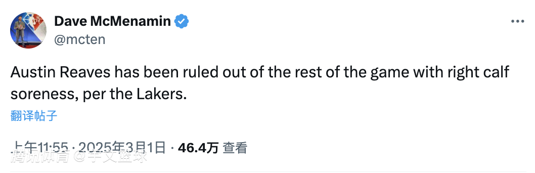 里夫斯首节出场9分钟因右小腿酸痛离场,他将接受核磁共振检查