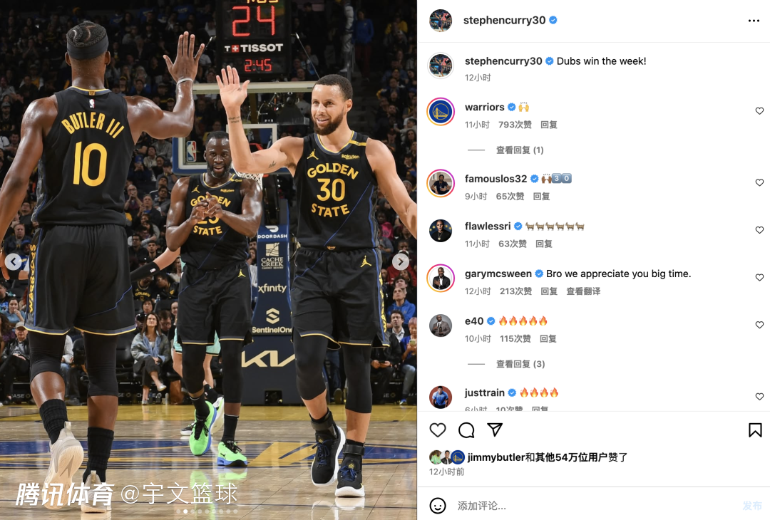 库里社媒发文庆祝勇士度过了出色的一周,勇士目前取得了一波5连胜升至西部第7,库里更是在面对魔术的比赛里命中12记三分狂砍56分!