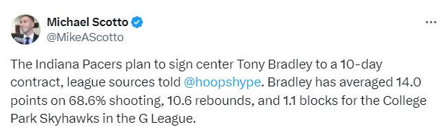 步行者计划与中锋托尼-布拉德利签下一份10天短合同