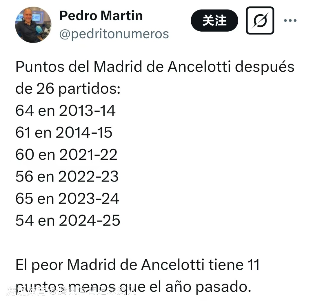 这一积分是安切洛蒂执教皇马以来,同期西甲26场比赛中的最低积分。以下是安切洛蒂执教期间皇马在西甲26轮后的积分情况: