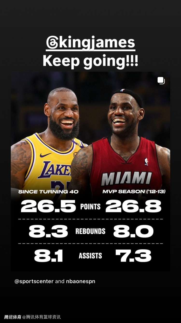 时间仿佛停滞!詹姆斯转发了自己40岁后与12-13MVP赛季数据对比