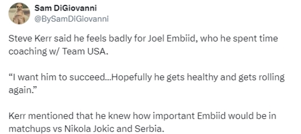 科尔表示:“我为他和76人队感到难过,我们的联盟很需要明星和伟大的球员……我希望他能取得成功,并在费城度过一段美好时光。希望他能尽快恢复健康,再次振作起来。”