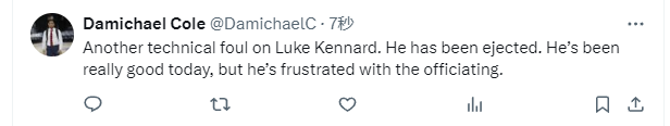 不满裁判吹罚?肯纳德领到个人第二次技术犯规 被驱逐出场
