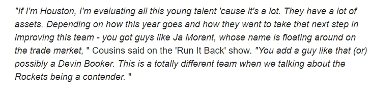 考辛斯说道:“如果我是火箭队的管理层,我会评估队内所有这些年轻的有天赋的球员,因为他们有很多潜力股,有很多资产。你将有机会得到莫兰特这样的球员,他的名字已经在交易市场的流言中出现,或者你也可以引进像布克这样的球员。那时候当我们谈及火箭队作为冠军争夺者的情况时,他们就完全是另一支不同的球队了。”