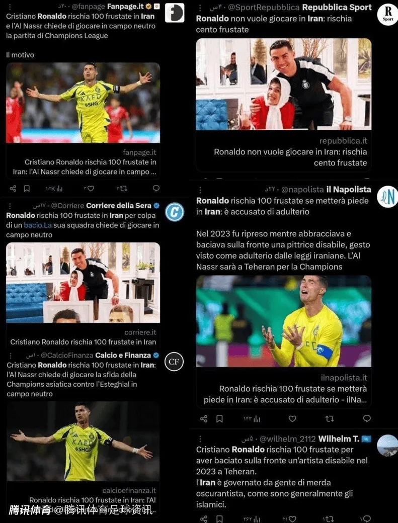 在过去24小时内,包括意大利的慢镜头、罗马体育报和共和报在内的多家知名媒体都报道了这一虚假消息,令许多人感到震惊。这些假新闻让C罗未前往德黑兰的决定看似“有理有据”,但任何理智的人都不会相信这样的说法。在网络时代,真假信息的界限愈发模糊,很多时候难以区分。