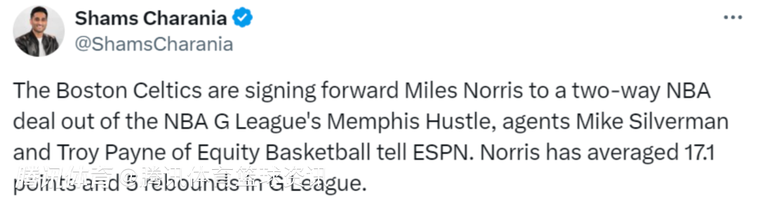 2025-03-03 08:40北京时间3月3日,据名记Shams报道,凯尔特人将和G联赛孟菲斯拼搏队前锋球员迈尔斯-诺里斯签下一份双向合同,在这之前,他们已经裁掉了安东-沃森。