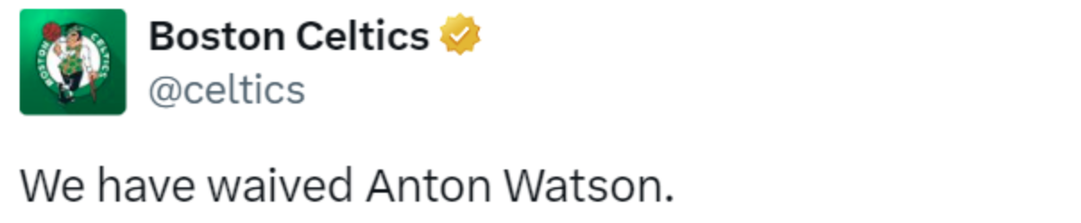 沃森是凯尔特人在去年选秀大会上摘下的54号新秀,本赛季他还没有为球队出战过一场比赛,不过在季前赛他则是有过亮相,为球队出战的3场比赛,沃森在场均7.7分钟的上场时间里,得到1.3分1篮板1助攻。