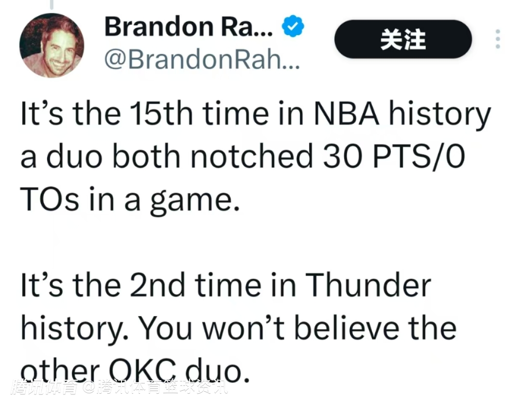 凭借两人的出色表现,亚历山大与杰伦-威廉姆斯成为雷霆队史上第二对同场得分均超过30分且零失误的组合,也是NBA历史上的第15对同场得分均超过30分且零失误的组合。