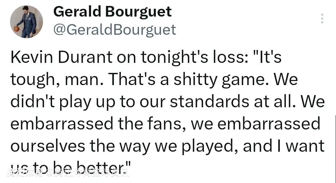 谈到本场比赛输球,杜兰特表示:“这场比赛令人倍感艰难。我们的表现糟糕透顶,完全未达到应有的水准。以这样的方式比赛,我们既辜负了球迷的期待,也让自身颜面尽失。我期望我们能有更出色的发挥。”