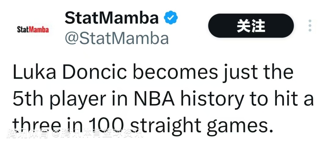 根据数据统计显示,凭借本场表现,东契奇已连续100场比赛至少命中1记三分球,成为历史第五人。在他之前,仅有库里(两次)、利拉德、科沃尔和博格丹-博格达诺维奇达成过这一成就。