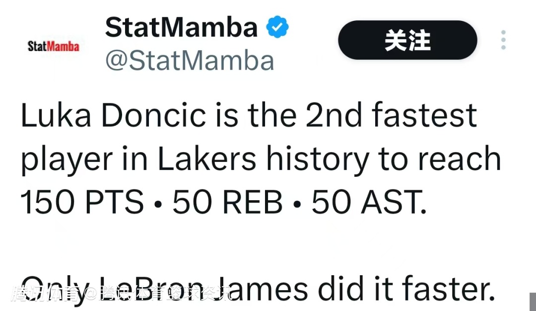 与此同时,在本场比赛之后,东契奇在加盟湖人后的8场比赛中累计得到150+得分、50+篮板和50+助攻,成为湖人队史上第二快达成这一数据的新援,仅次于詹姆斯。