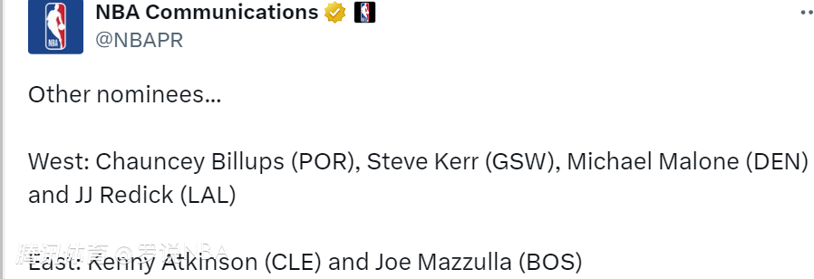 西部:比卢普斯(开拓者)、科尔(勇士)、马龙(掘金)、雷迪克(湖人)