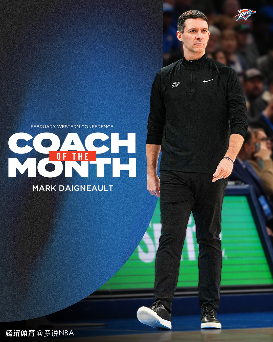 戴格诺特在2月份率领雷霆打出11胜2负的战绩,同期胜率(84.6%)排名西部第一,联盟第二(仅次于骑士的90.9%)。这是戴格诺特生涯第二次当选月最佳教练,他在本赛季的12月份也曾获得这一奖项。