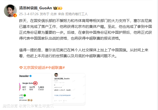 2025-03-04 08:10北京时间3月4日,据体育博主“清蒸树袋熊_GuoAn”发布的消息显示,国安中场塞尔吉尼奥已基本完成了落户工作,球员将获得北京市的集体户籍。
