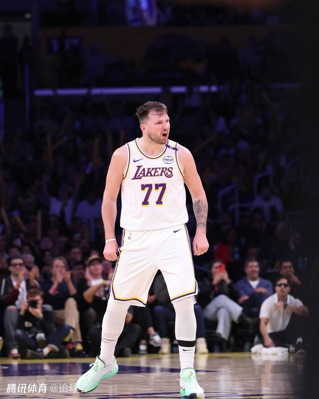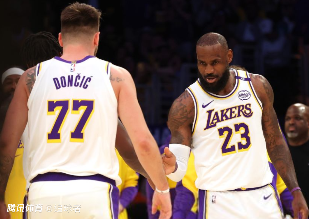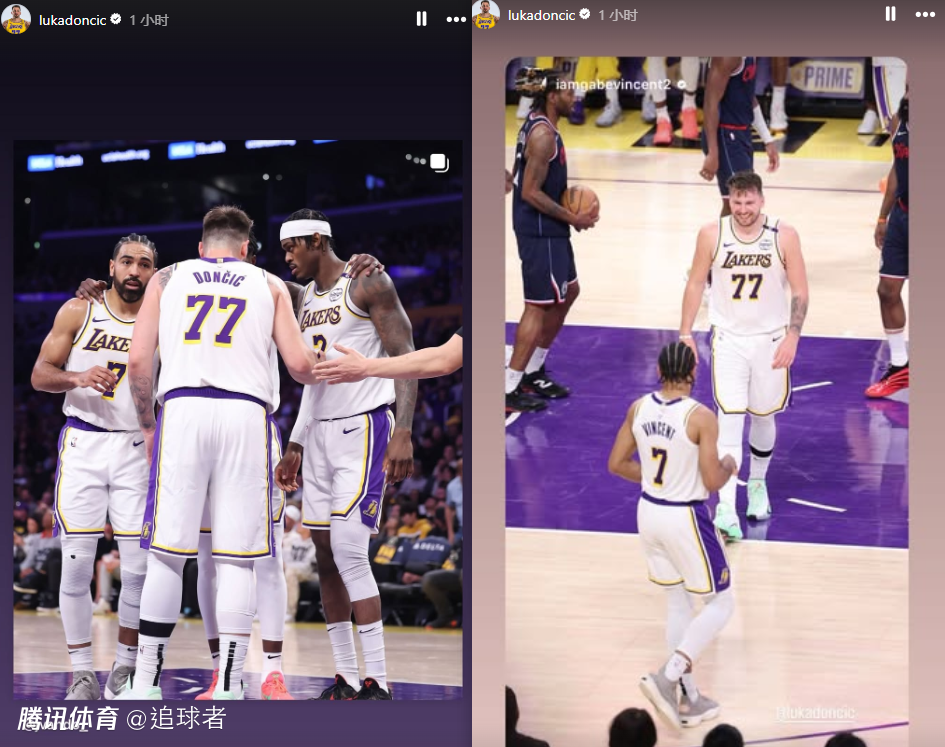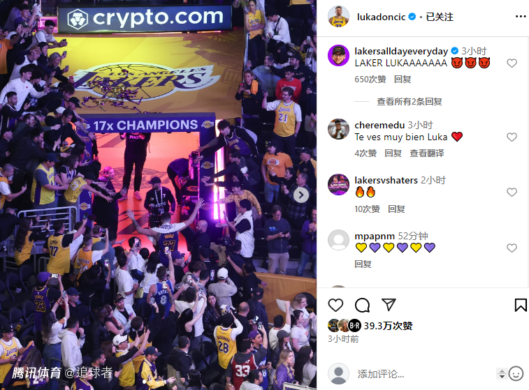 东契奇晒出自己身穿湖人77号球衣对阵快船的赛场照——双手握拳怒吼庆祝,离场时与球迷击掌,球员通道入口处的“17座总冠军”字样十分醒目。