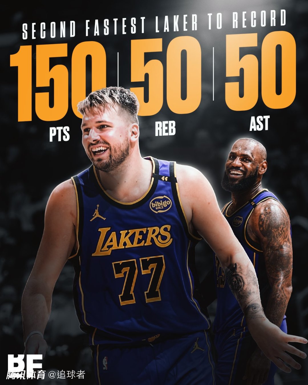 东契奇加盟湖人后用了8场比赛就累计达成至少150分50助攻50篮板,成为湖人队史达成此数据第二快的新援,仅次于詹姆斯。