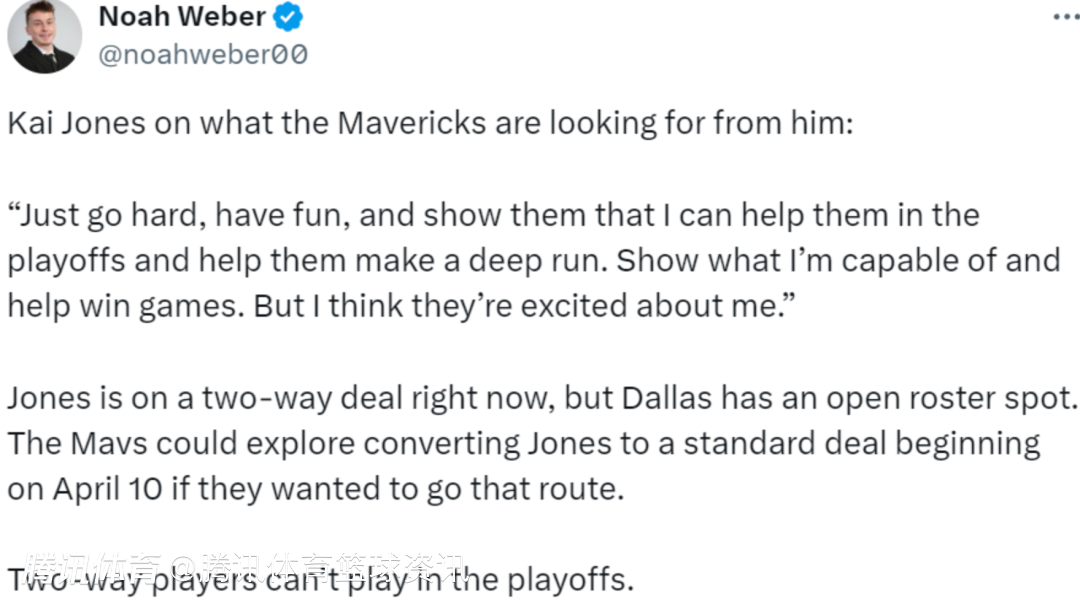 琼斯和独行侠签的是双向合同,球队现在还有一个空缺的正式名额,如果独行侠愿意,可以在4月10日考虑把他的合同转为标准合同。双向合同球员不能够参加季后赛。