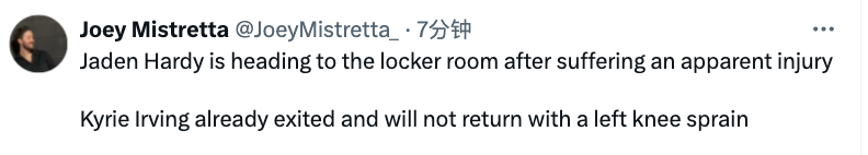 2025-03-04 11:20北京时间3月4日,NBA常规赛,独行侠坐镇主场对阵国王,欧文在一次突破过程中膝盖和瓦兰对撞,反关节受伤,本场比赛不会回归,而在不久之后,独行侠另外一名球员哈迪也伤退离场。