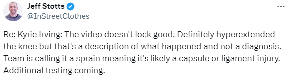 另一医学专家Jeff Stotts表示,从受伤画面来看,欧文的情况不太好,膝盖确实过度伸展,球队称这是扭伤,这可能意味着关节囊或韧带损伤。