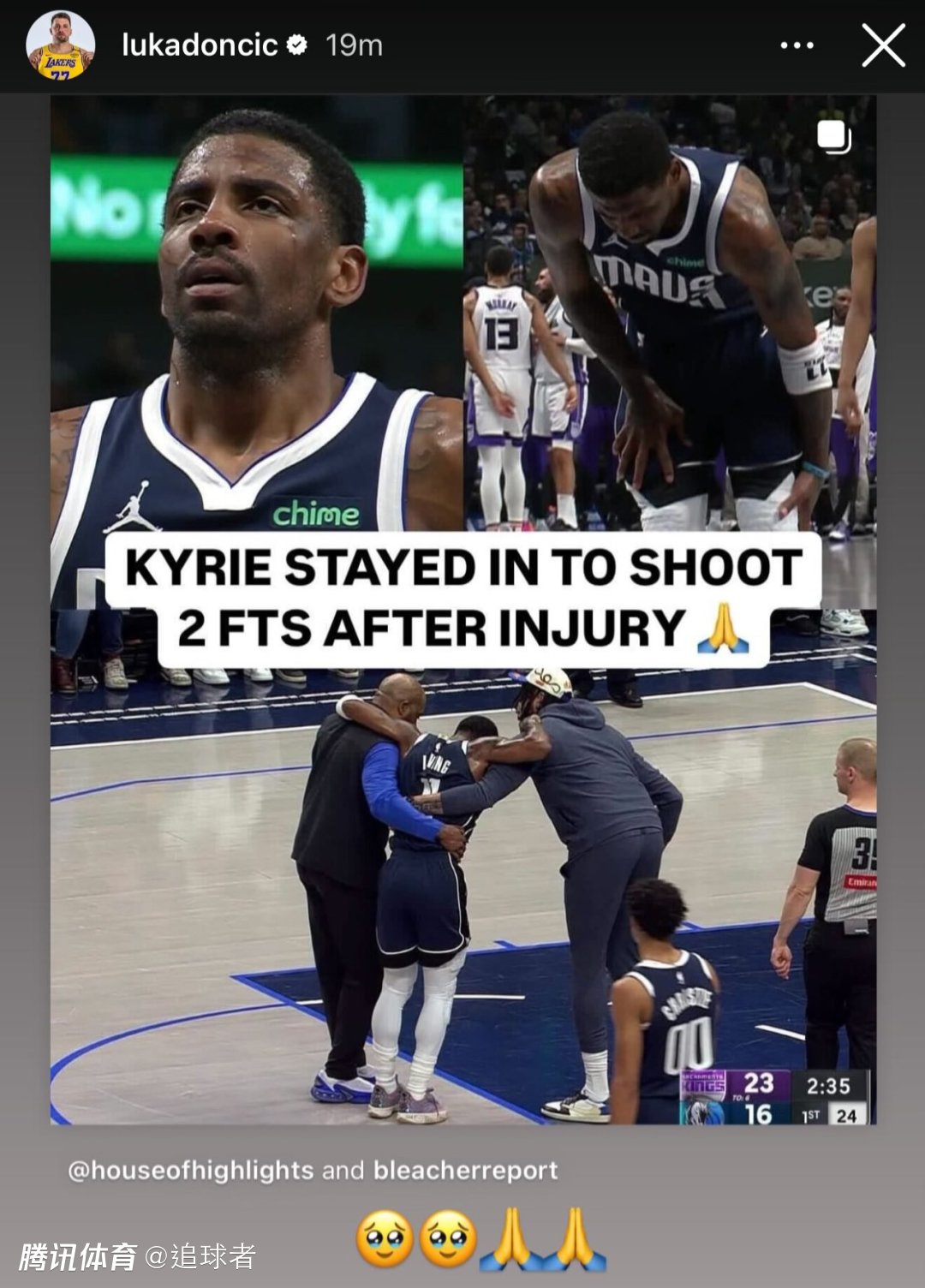 欧文重伤离场,湖人球星东契奇转发欧文受伤的画面,配上祈祷和流泪的表情,很明显,看到欧文受伤,东契奇十分难受。