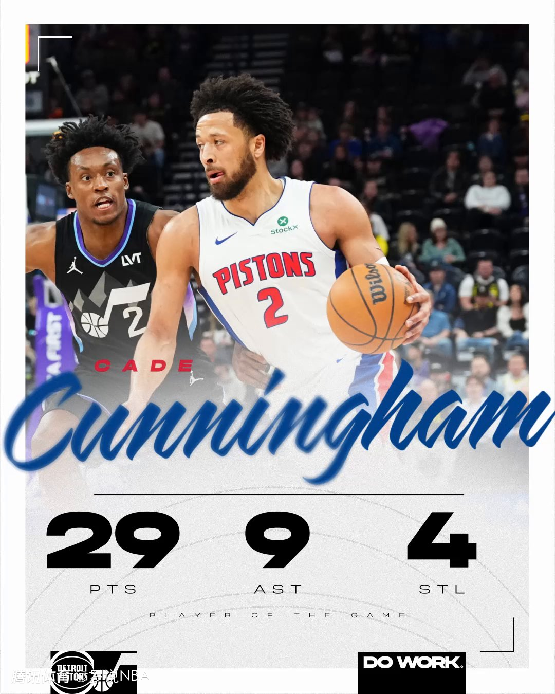 坎宁安29分9助攻,带领活塞大胜爵士。活塞依然位居东部第6,但他们有望继续提升排名。这匹联盟最大的黑马,现在距离前面的雄鹿和步行者都只差0.5个胜场了。