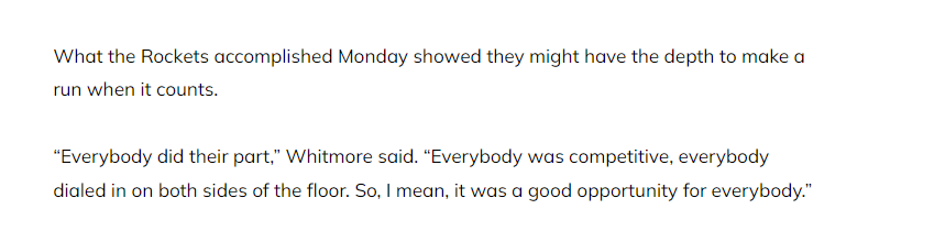 当谈到与谢泼德并肩作战时,惠特莫尔笑着说道:“这感觉就像夏季联赛。”有评论称,今天火箭出场队员在比赛中展现出的潜力,证明他们或许具备足够的阵容深度,在关键的时刻能够发起有力的冲击。